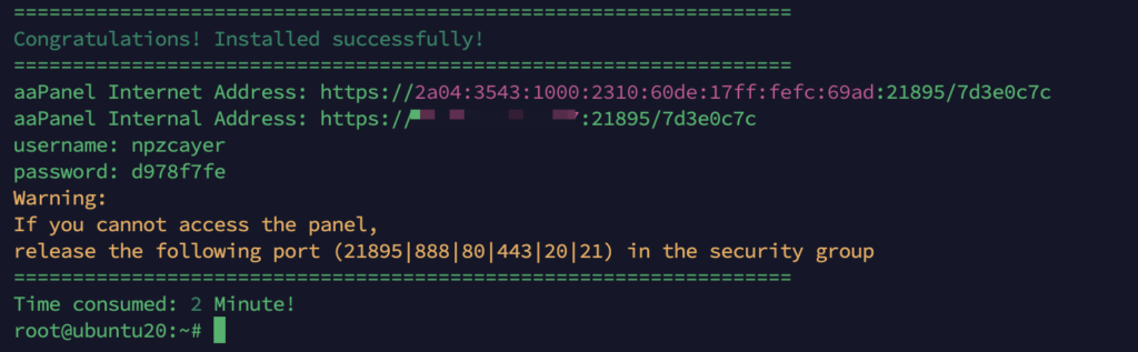 Sau khi bạn tiếp tục quá trình cài đặt, quá trình sẽ diễn ra tự động. Chờ cho đến khi cài đặt hoàn tất. Khi quá trình này kết thúc, hệ thống sẽ cung cấp thông tin đăng nhập vào AAPanel mà bạn vừa cài đặt.