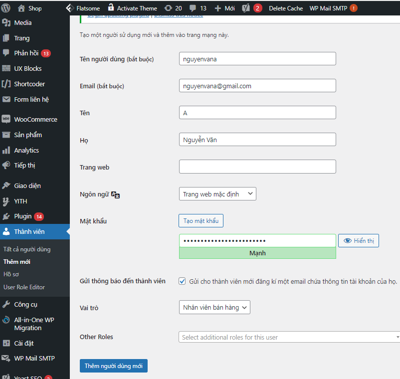 Sau khi có Role bạn có thể vào chức năng tạo User để tạo tài khoản mới và chọn vai trò là “Nhân viên bán hàng”. Sau khi tạo thành công tài khoản hãy mở trang web bằng trình duyệt web khác và đăng nhập với tài khoản quyền nhân viên bán hàng. Bạn sẽ thấy sự khác biệt về các quyền sử dụng trong tài khoản quyền nhân viên.