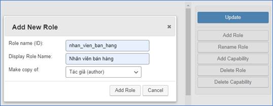 Bạn có thể tạo vai trò mới và thiết lập chọn các chức năng cho vai trò mới. Giả sử tạo một vai trò là “Nhân viên bán hàng” bạn bấm nút “Add Role” và tiến hành nhập các thông tin như hình dưới đây.