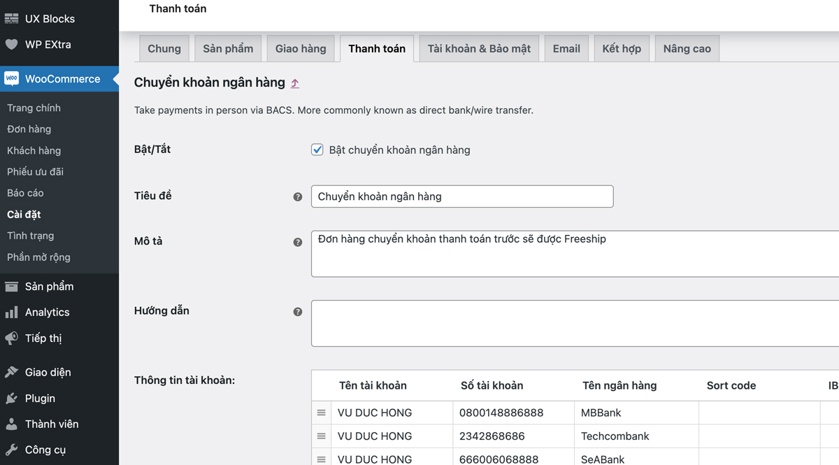 Cấu hình chuyển khoản ngân hàng trong WooCommerce