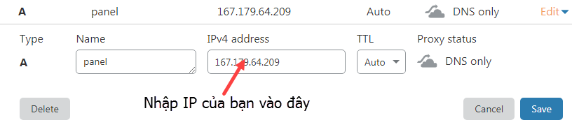 Việc đầu tiên là phải trỏ tên miền phụ trên về IP host đang chạy CP, cách nhanh nhất là thông qua Cloudflare (nhưng bạn đừng bật đám mây màu vàng lên, chỉ dùng DNS thôi, vì proxy của Cloudflare chặn cổng 8090).
