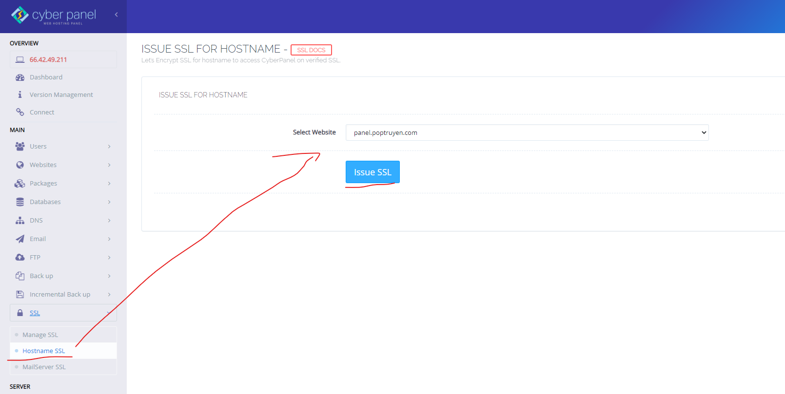 Tiếp theo bạn vào SSL > Hostname SSL rồi chọn subdomain vừa nãy để liên kết nó với trang quản trị của Cyberpanel.